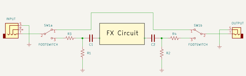 There is an alternative true bypass wiring approach that eliminates the need for the input-side pull-down resistor by connecting the effect circuit’s input to ground when the pedal is in bypass mode. It’s called the Grounded Input Wiring Scheme.