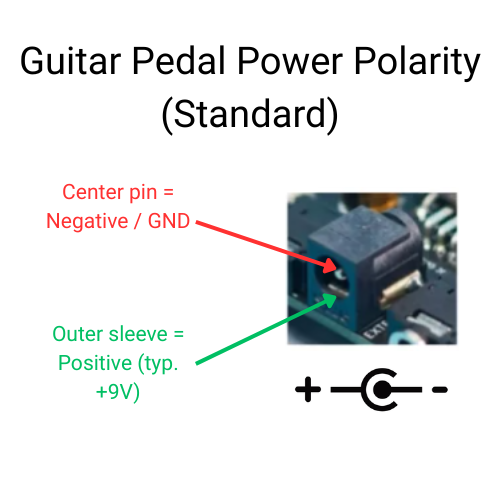 Center negative is the opposite of most consumer electronics, which use center positive connectors. Generic wall-adapters, laptop chargers, and unregulated AC adapters all operate differently from guitar-pedal-specific supplies. Using the wrong one, even at the correct voltage, can result in reverse polarity at the pedal’s power jack.