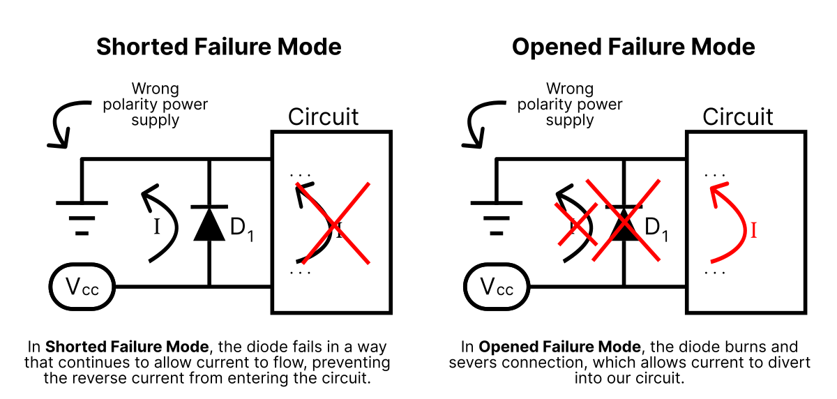 Figure 4.6: Left: Diode fails shorted – pedal goes dead, circuit intact. Fix: replace diode. Right: Diode fails open – protection removed. If supply is still reversed, circuit exposed.