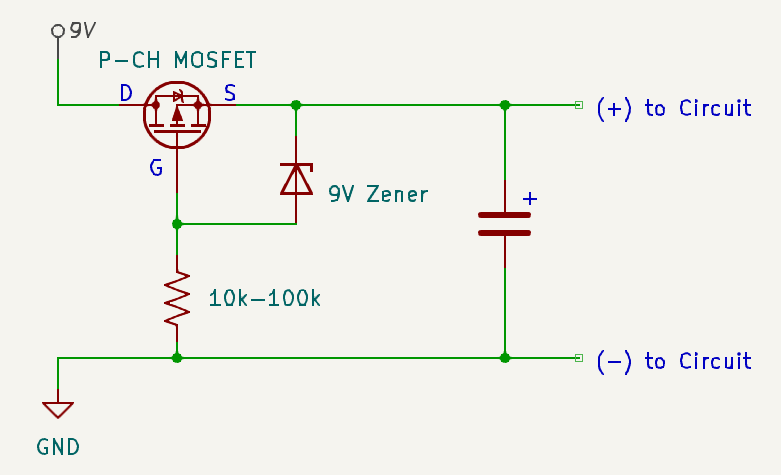 Series diode protection has one primary cost: the forward voltage drop. For a 9V supply with a silicon diode, approximately 8.35V reaches the circuit. For most pedal designs this is acceptable – bias voltages derived from the supply shift proportionally, and the circuit still functions correctly. But it is a real reduction, and for circuits designed specifically to operate at exactly 9V, it is worth addressing.